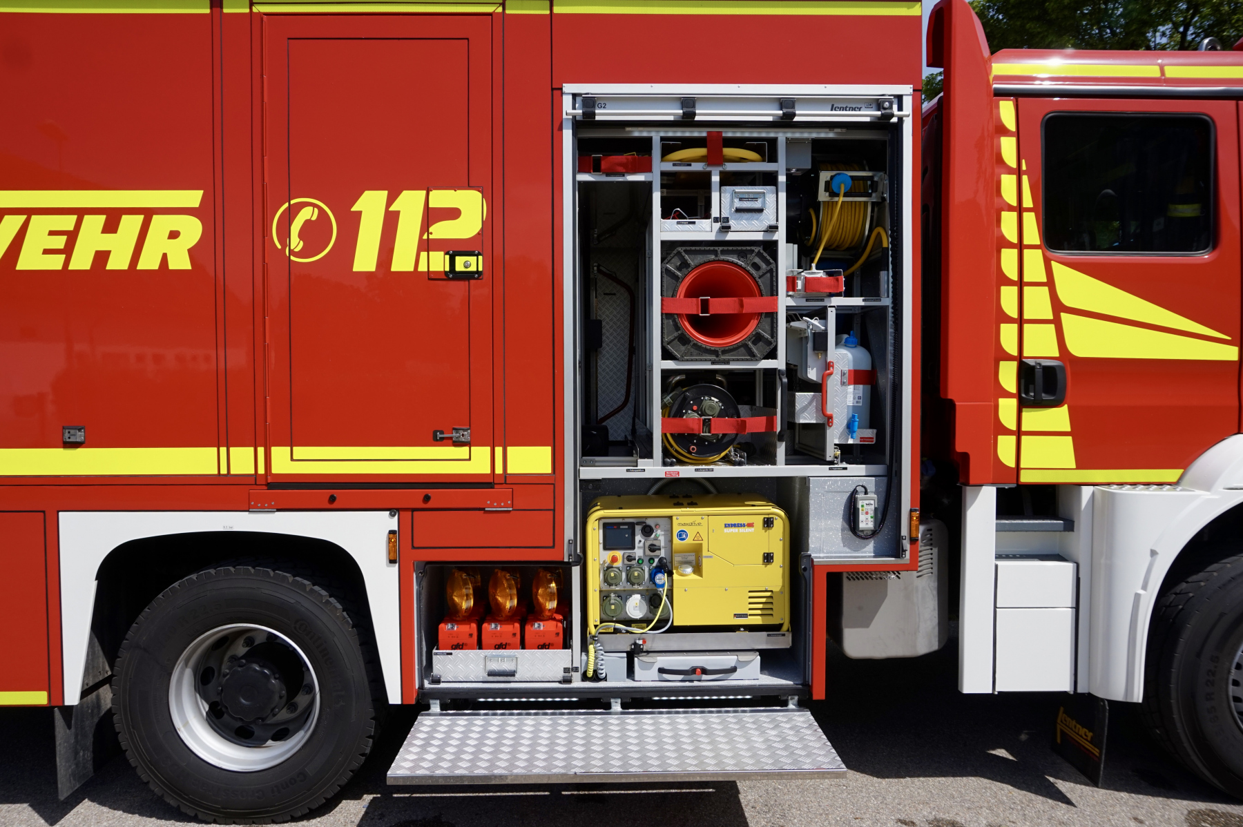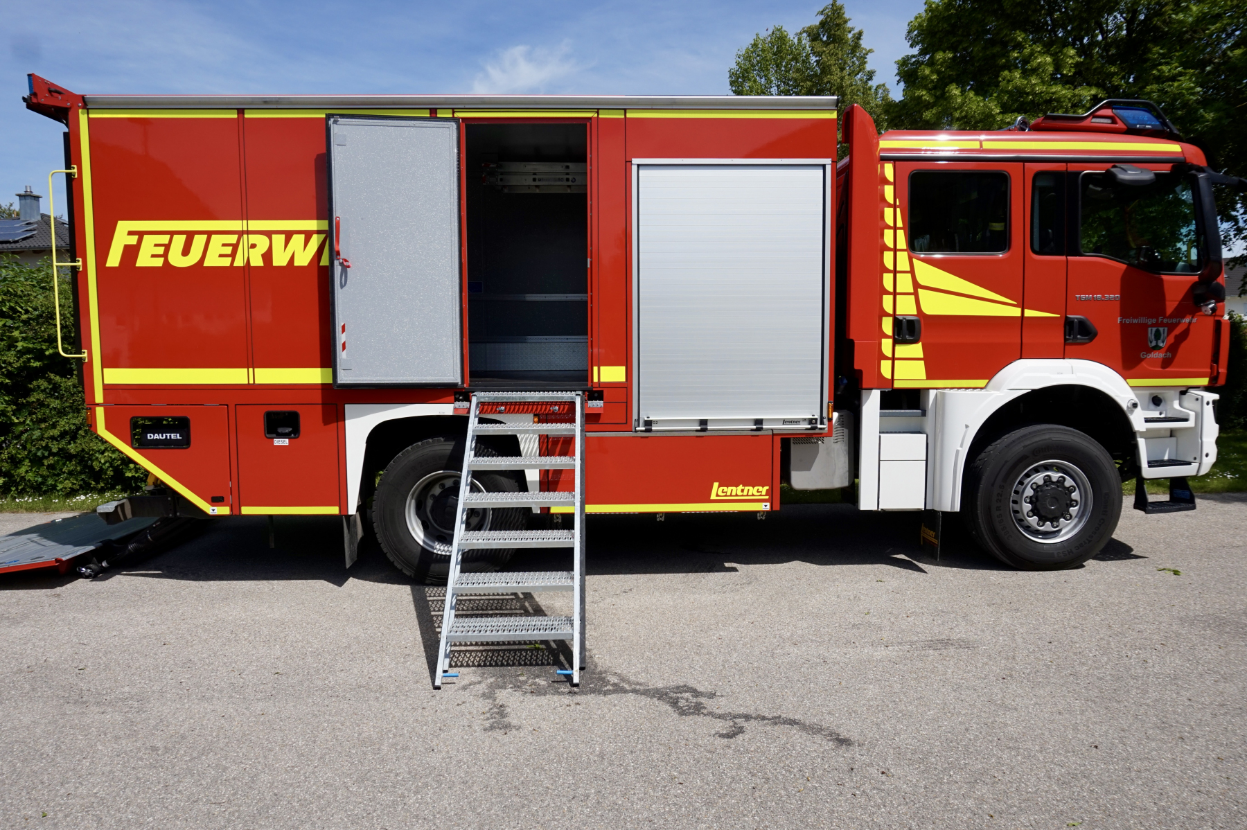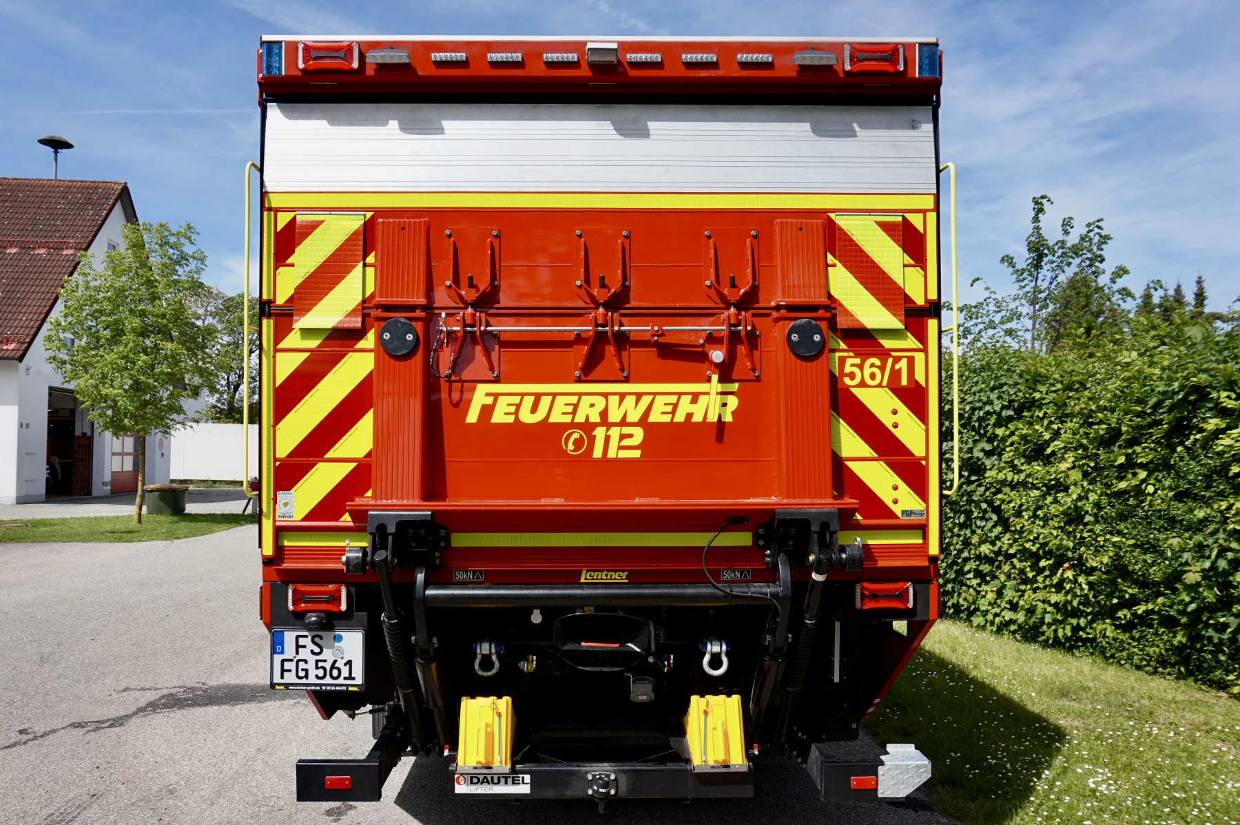 Das LF 16/12 ist kein klassisches Löschgruppenfahrzeug seiner Art. Besonders an diesem Fahrzeug ist seine Beladung für Gefahrguteinsätze. Zusammen mit dem Gerätewagen-Logistik rückt es als Dekontaminations-Einheit für den Landkreis Freising aus.
