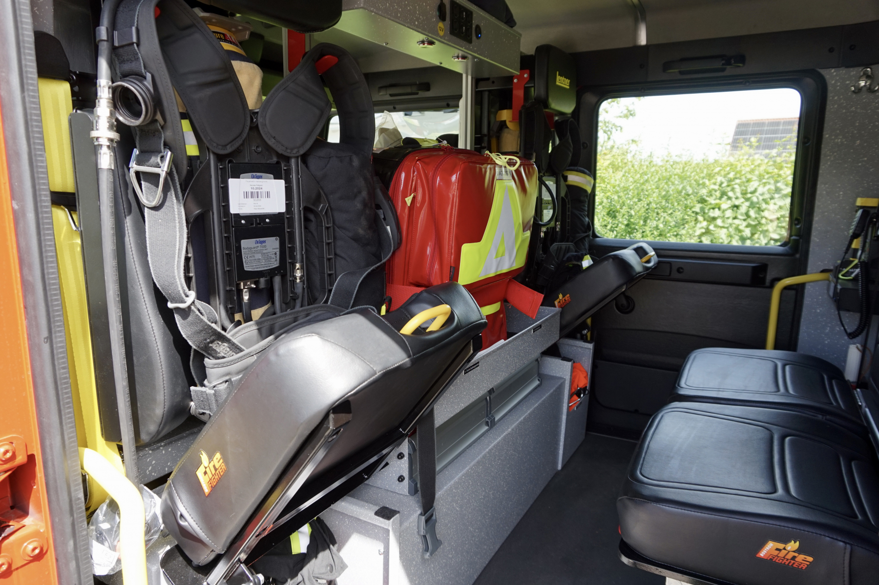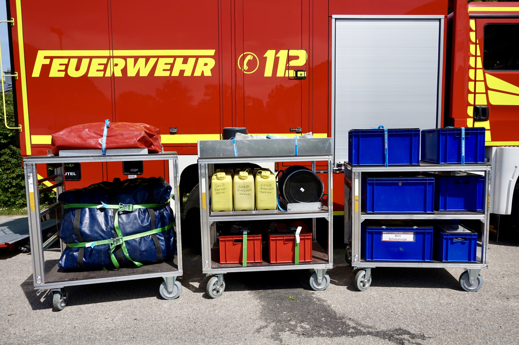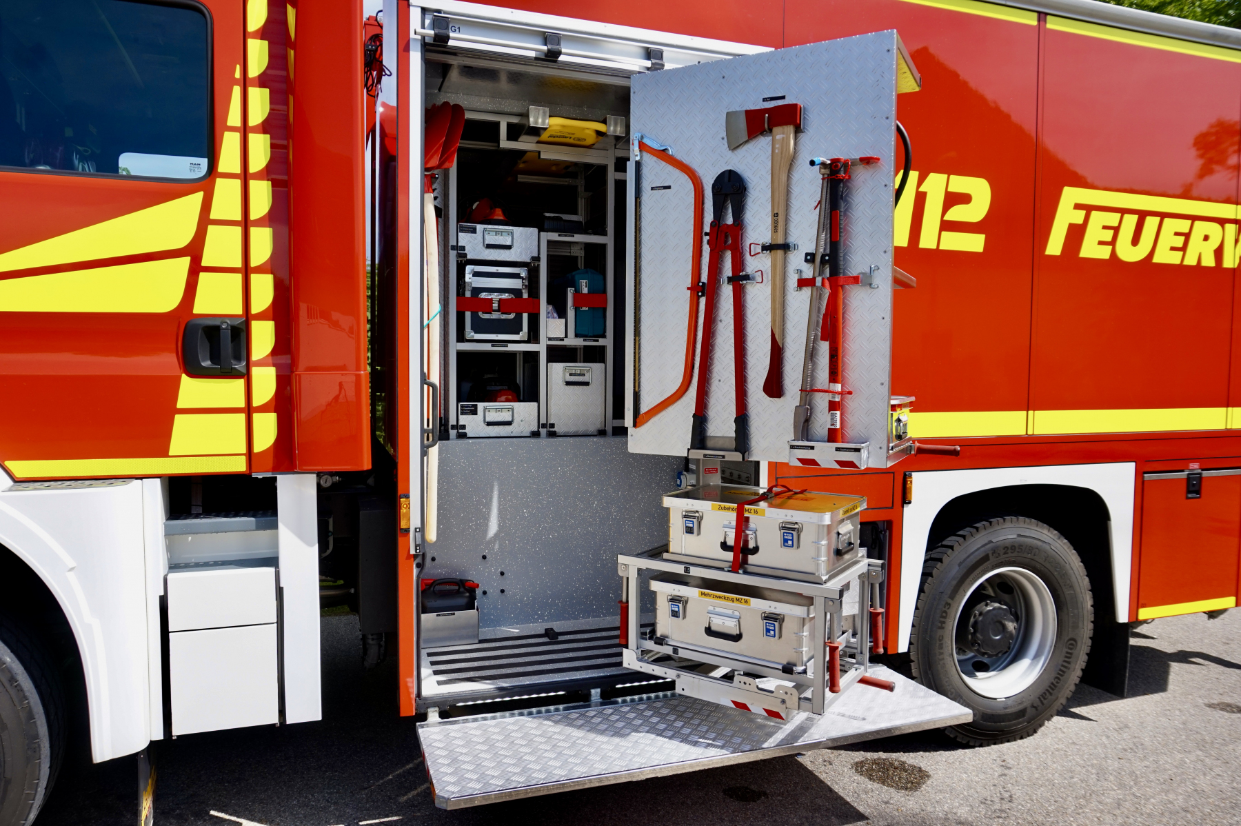 Das LF 16/12 ist kein klassisches Löschgruppenfahrzeug seiner Art. Besonders an diesem Fahrzeug ist seine Beladung für Gefahrguteinsätze. Zusammen mit dem Gerätewagen-Logistik rückt es als Dekontaminations-Einheit für den Landkreis Freising aus.