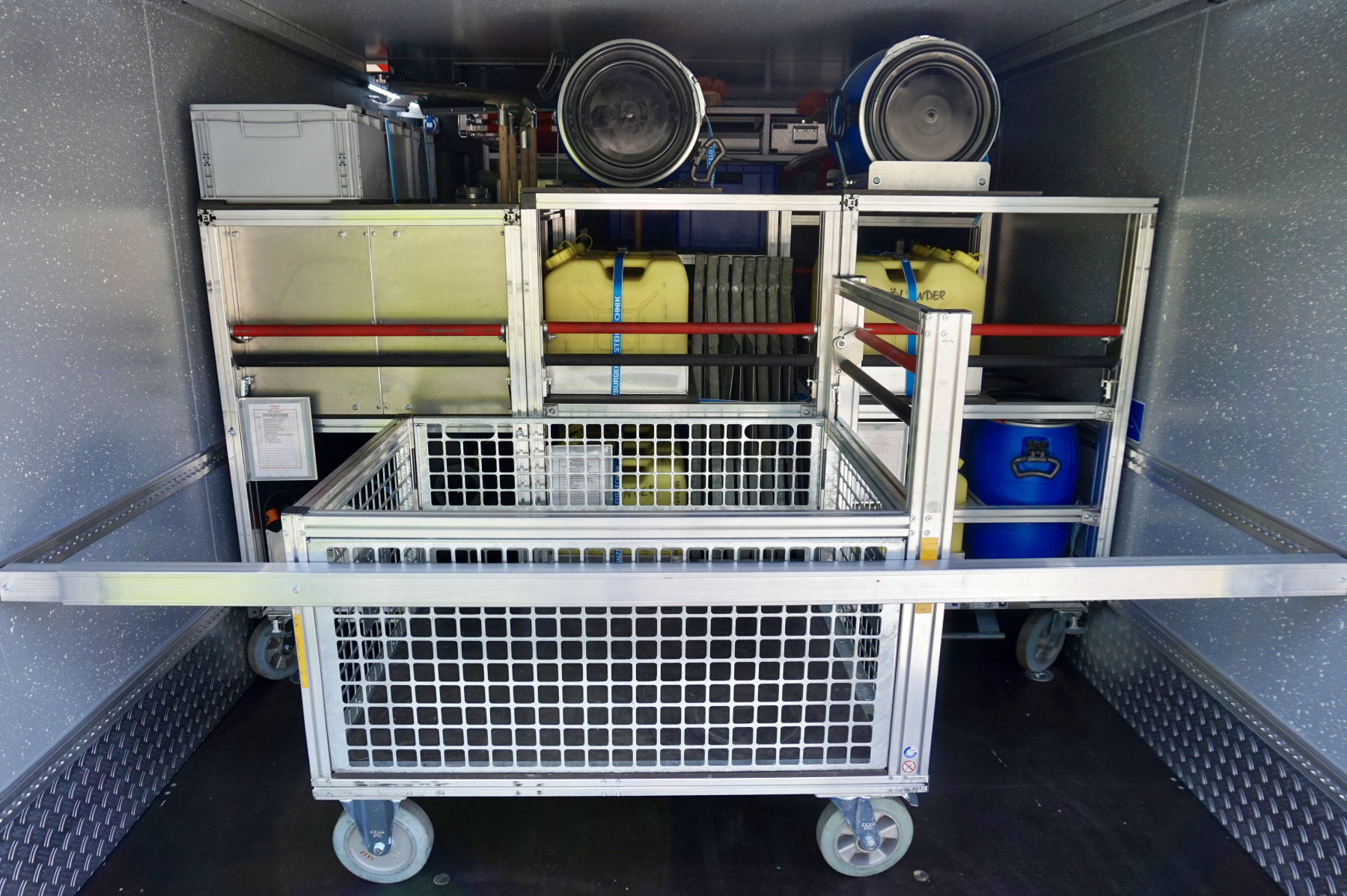 Der LKW mit bietet Platz für bis zu 10 Rollcontainer bzw. Euro-Paletten. Standardmäßig befinden sich 7 Rollcontainer mit unterschiedlicher Beladung auf der Ladefläche. Durch die seitliche Tür mit Treppe und einer Standheizung kann die Ladefläche auch als witterungsunabhängiger Aufenthalts- oder Umkleideraum genutzt werden. Die teilbare Ladebordwand ermöglicht eine Schlauchverlegung während der Fahrt in Schrittgeschwindigkeit von der Ladefläche aus. Zusammen mit dem Florian Goldach 41/1 rückt der Gerätewagen Logistik 2 als Dekontaminations-Einheit für den Landkreis Freising aus.