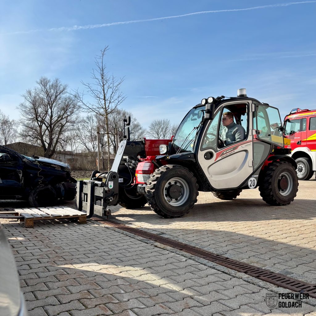 Noch zum Jahreswechsel 2025/2026 wurde für die Feuerwehr Goldach ein neues Fahrzeug beschafft. Der gebrauchte Teleskopstapler, der aus einem Mietpark heraus erworben wurde, ist ein Manitou MT 625 H Comfort. Mit einer maximalen Tragkraft von 2.500 kg, einer Hubhöhe von bis zu 5,85 Metern sowie einer maximalen Reichweite von 3,40 Metern eignet sich das kompakte Arbeitsgerät unter anderem zur Beschickung der Hochregale im neuen Feuerwehrhaus. Darüber hinaus können mit der Palettengabel sowohl im Einsatz als auch in Übungen Lasten gehoben werden. Bis zum Umzug in die neue Bleibe wird der Teleskopstapler noch mit Kontur- und Warnmarkierungen beklebt und für den Feuerwehrdienst fit gemacht. Ein erster Grundstein für die Verwendung bei der Feuerwehr wurde bereits am 13. und 14. März gelegt. Hier erhielten 23 Feuerwehrmänner die Grundlagen zum Fahren geländegängiger Teleskopstapler in Theorie und Praxis vermittelt. Vielen Dank hierfür an Stephan Steinberger vom Kreisfeuerwehrverband Freising.